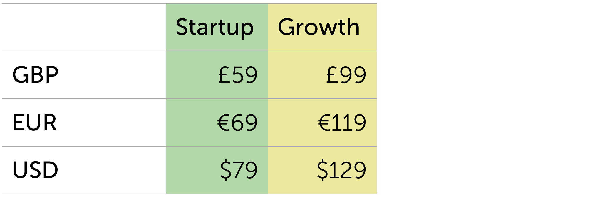 Here are the EUR and USD pricing for the Startup and Growth plans, also available on our pricing page: